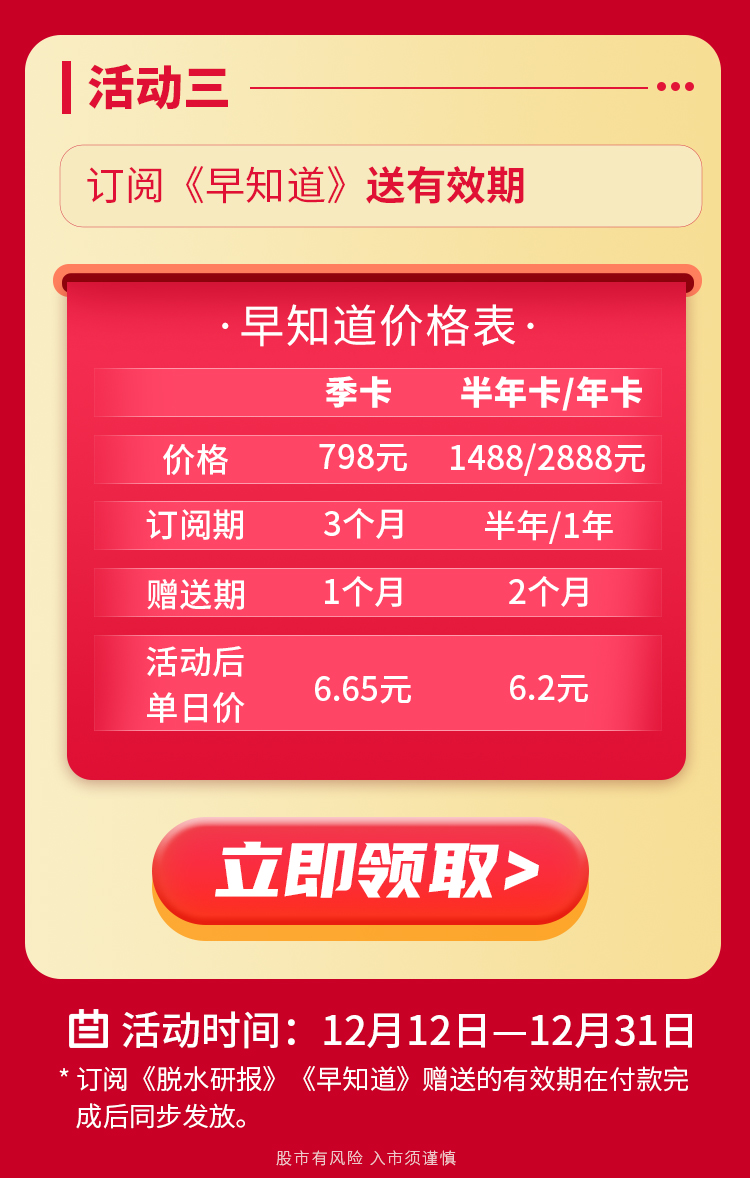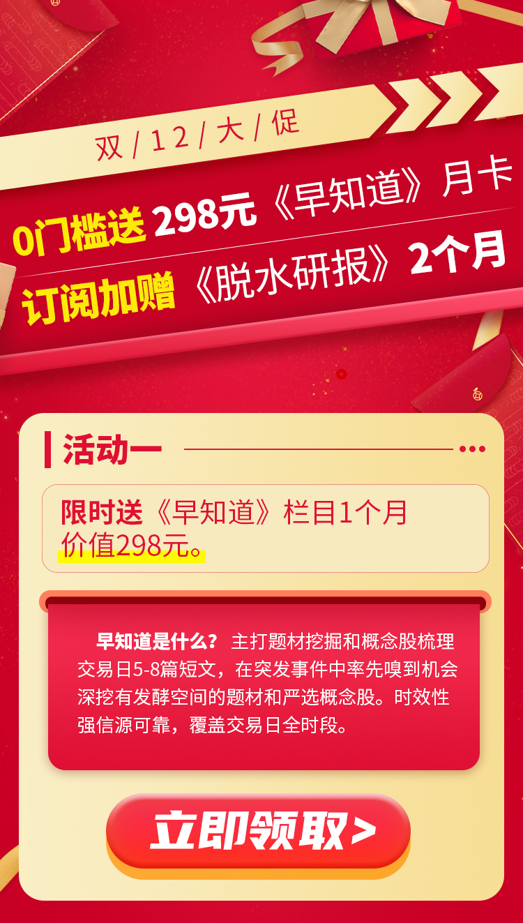 双十二!0门槛送298元《早知道》月卡,订阅送2个月《脱水研报》