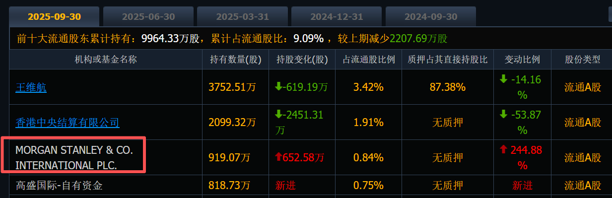 比如华胜天成,该公司与字节跳动的合作主要集中于火山引擎,合作覆盖 AI 产业落地、云原生技术、政企行业解决方案等多个核心领域。截止三季度末国际一线投行摩根士丹利有大幅加仓动作,如图所示: