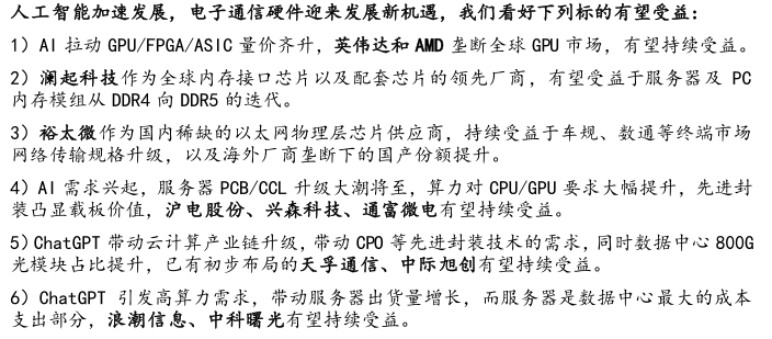 研报来源:国金证券,樊志远,S1130518070003,人工智能加速发展,电子通信硬件迎来发展新机遇。