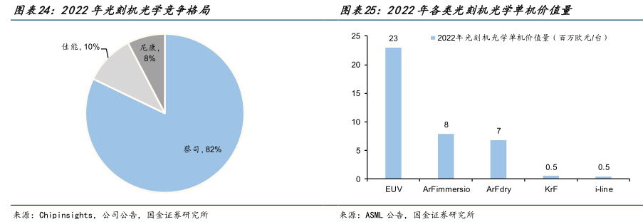 蔡司为ASML的光学部件独家供应商,蔡司的光刻机光学部件约占ASML产品成本的26%。2022年蔡司半导体收入为28亿欧元,我们估算全球光刻机光学部件市场规模为35亿美元,中国光刻机光学部件市场规模为5亿美元。