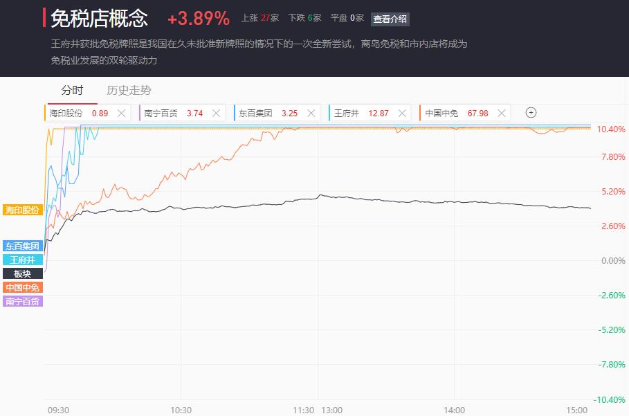 免税店板块盘中一度涨超5%,最终收涨3.89%。
