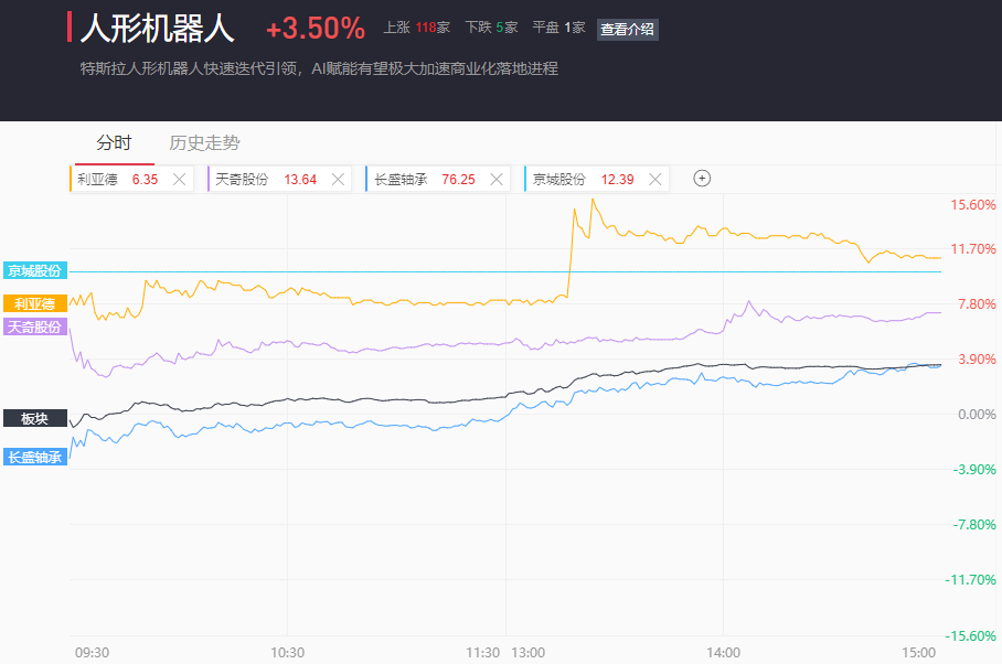 天工机器人概念股的京城股份一字板全天,天奇股份(与优必选合作)大幅高开震荡收涨超7%;