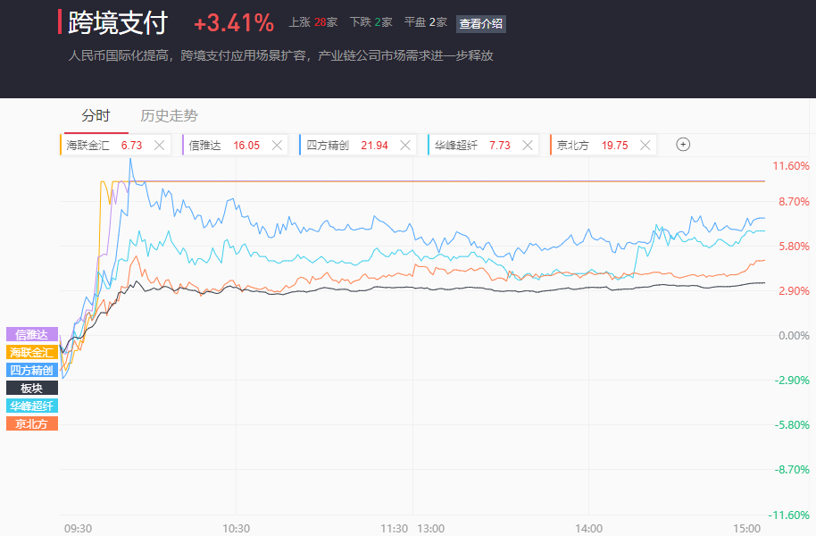 跨境支付概念走强,海联金汇、信雅达先后涨停,四方精创、华峰超纤、新国都、京北方、高伟达、中油资本、小商品城等大幅共振走强;