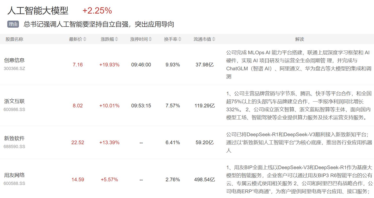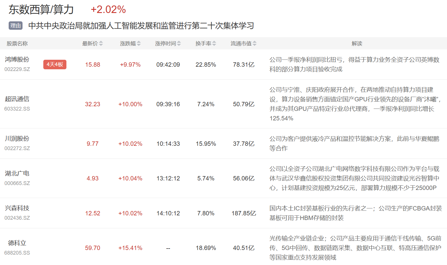 今日人工智能大模型、算力等个股继续活跃,鸿博股份4连板,创意信息、超讯通信等多股涨停。