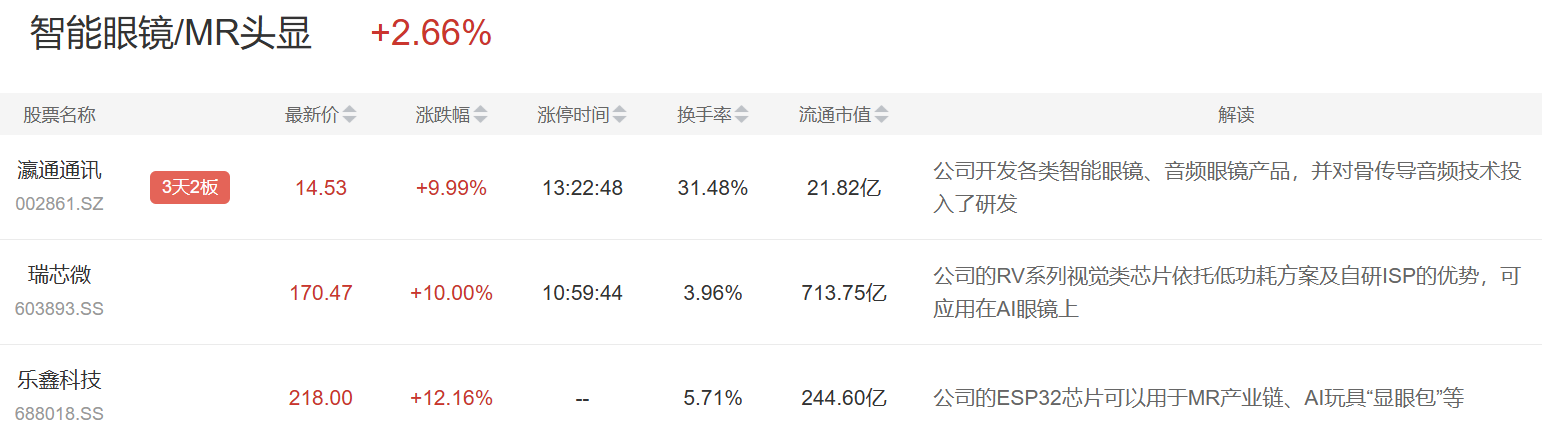 智能眼镜板块今日表现,瀛通通讯、瑞芯微涨停,乐鑫科技涨超10%。