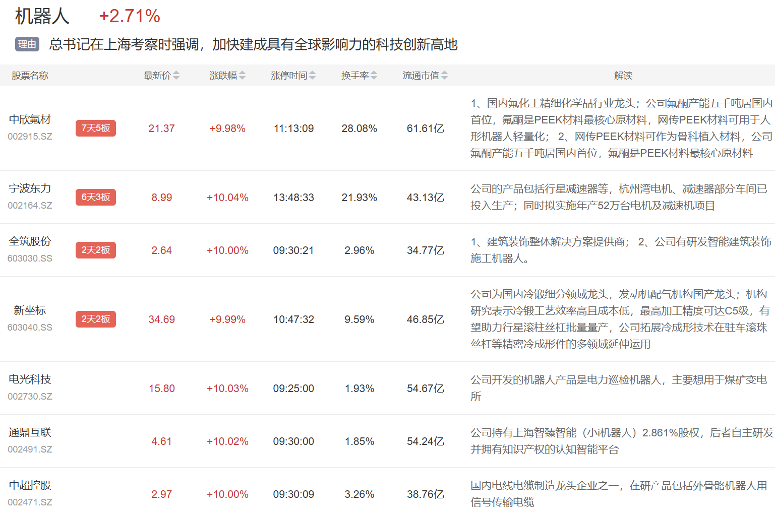 机器人概念今日继续大涨,PEEK材料中欣氟材再度涨停,外骨骼机器人概念也发酵,中超控股、探路者、振江股份等相继涨停。
