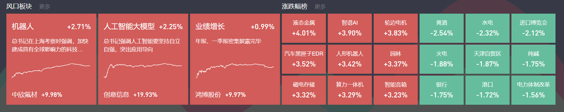 除上述热点外,业绩增长、国产芯片、地产等局部活跃;跌幅方面,新零售、电力等跌幅居前。