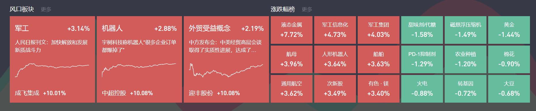 除上述热点外,高铁、卫星互联网等均有活跃;跌幅方面,代糖、创新药等跌幅居前。