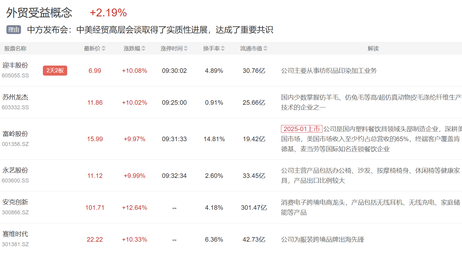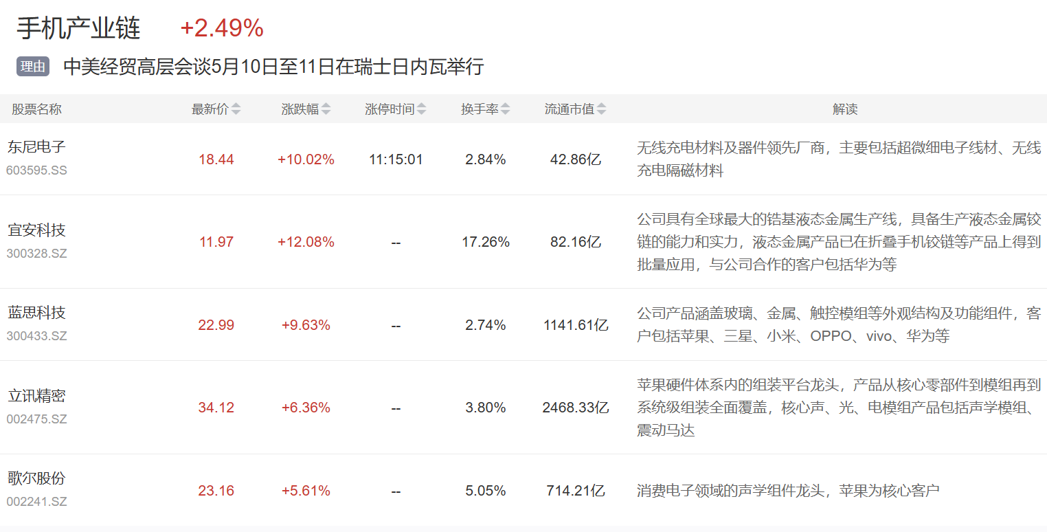 外贸受益概念、手机产业链板块今日活跃,迎丰股份2连板,苏州龙杰涨停;手机产业链,朝阳科技涨停,蓝思科技、歌尔股份等大涨。