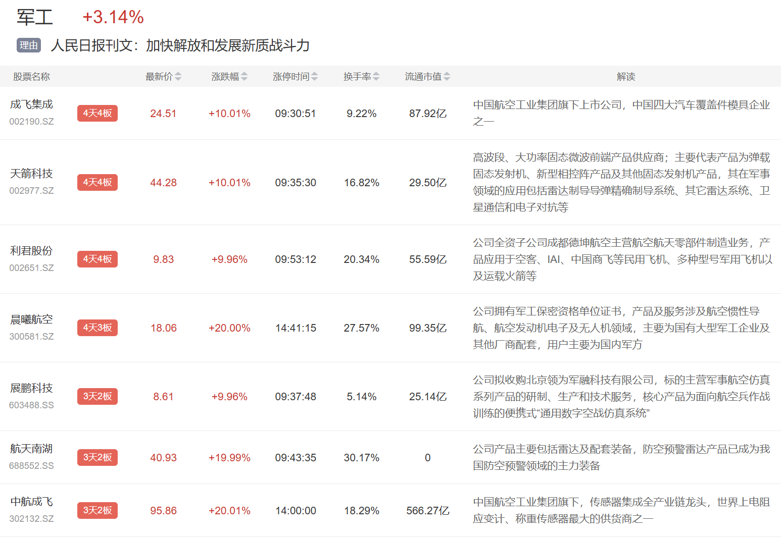 军工板块今日继续大涨,成飞集成、天箭科技4连板,航天南湖、中航成飞等反包涨停。