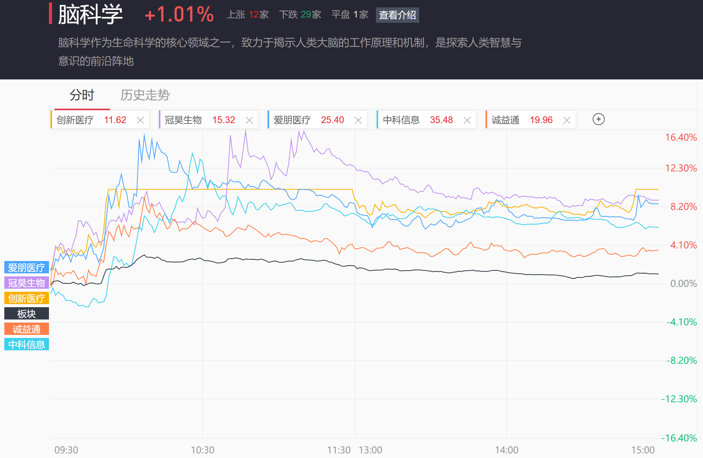 脑科学板块上午一度涨超3%,此后单边回落,最终收涨1.01%。