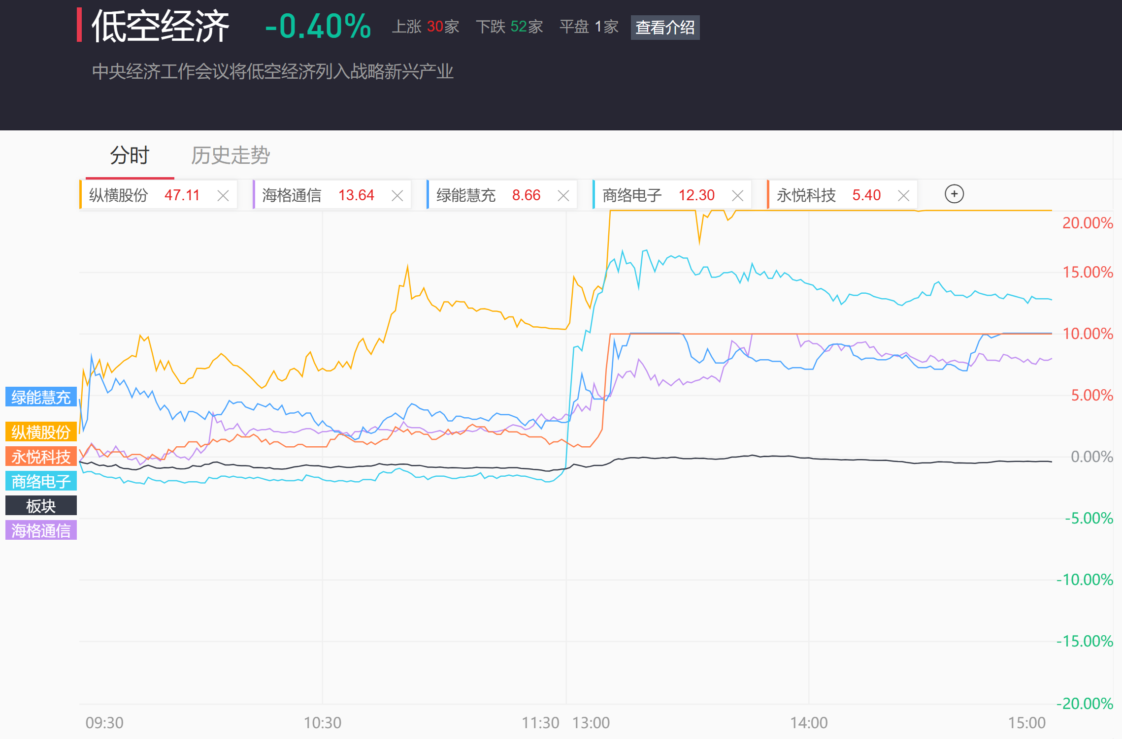 低空经济午后发力,纵横股份(20CM)、绿能慧充、永悦科技、海格通信(炸)、路桥信息(30CM)涨停,商络电子午后水下爆拉一度涨超17%,深城交、莱斯信息、广联航空、上工申贝、航天彩虹等集体走强;