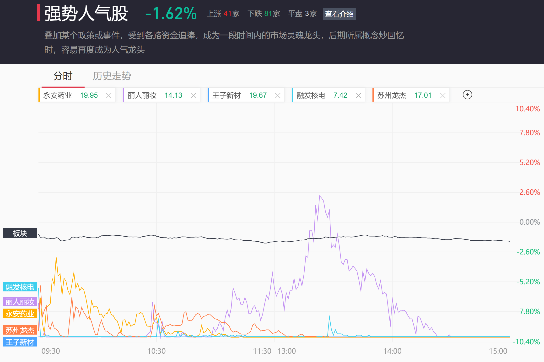 强势股集体重挫,王子新材、融发核电、苏州龙杰、丽人丽妆、中超控股、尚纬股份、尤夫股份、国芳集团、永安药业、京华激光、渝三峡A等集体跌停;