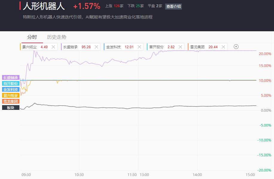 人形机器人在宇树机器人启动IPO刺激下走强,参股的首开股份、景兴纸业、雪龙集团集体涨停,产业链上中大力德、金发科技、卧龙电驱、长盛轴承(20CM)涨停,鸣志电器、兆威机电、江苏雷利、宝通科技等早盘均大幅走强;
