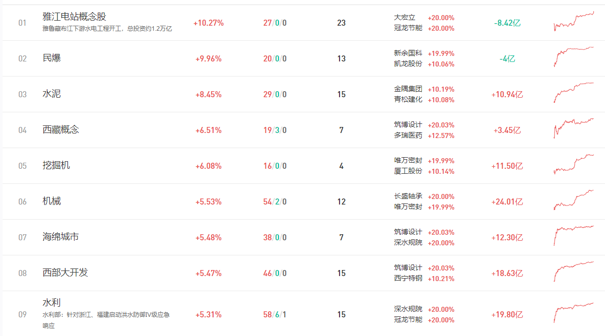 题材方面,雅下水电站成为日内唯一的神,带动民爆、水泥、钢铁、水利、基建、西藏本地股集体大涨,一字板、涨停板如潮,个股不再赘述;