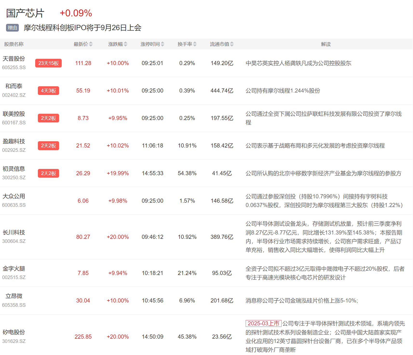 国产芯片概念今日强势,天普股份15连板,和而泰、联美控股、盈趣科技等多股连板,长川科技、矽电股份等涨停。