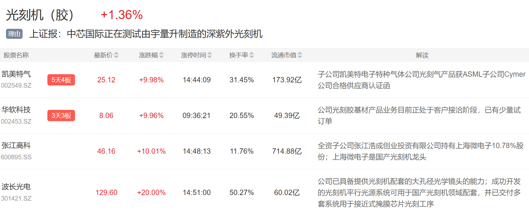 光刻机概念今日继续活跃,华软科技3连板,临近尾盘张江高科、凯美特气、波长光电等涨停。