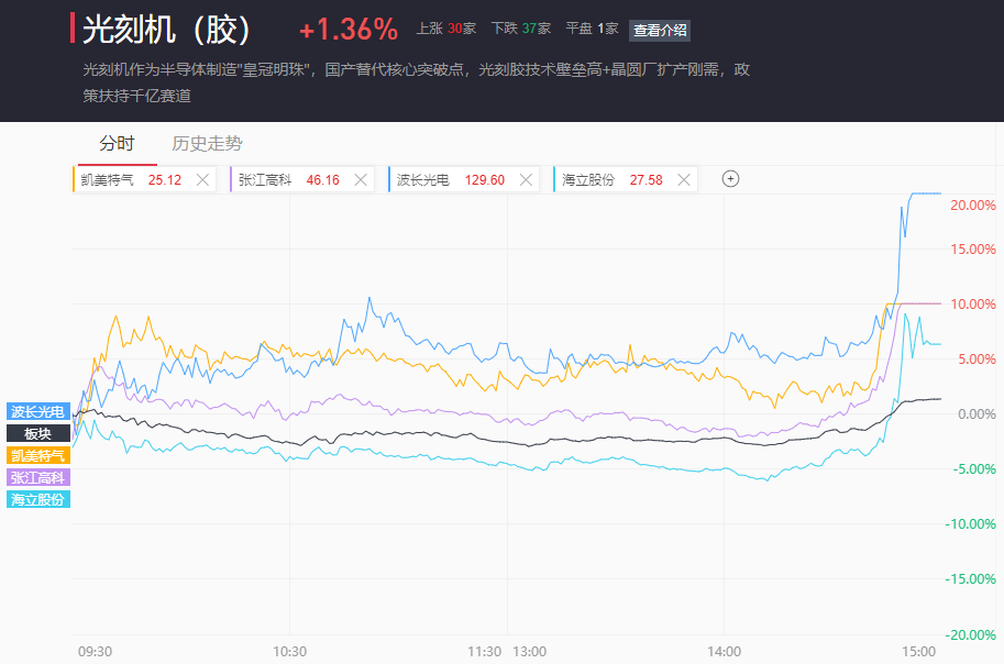 尾盘阶段,光刻机板块大幅拉升带动情绪回暖,凯美特气3连板,张江高科、波长光电(20CM)涨停,宝丽迪、海立股份、强力新材、芯碁微装等大涨;