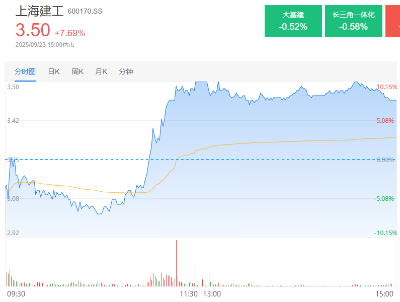 但此后上海建工开始“作妖”了,从深水开始震荡走强后大幅拉升,在上午收盘前涨停,午后炸板回落收涨7.7%。