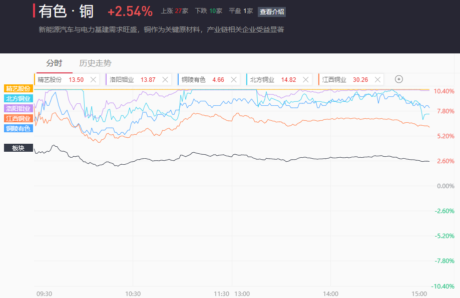 有色铜板块早盘一度涨超4%,此后小幅回落,最终收涨2.54%。