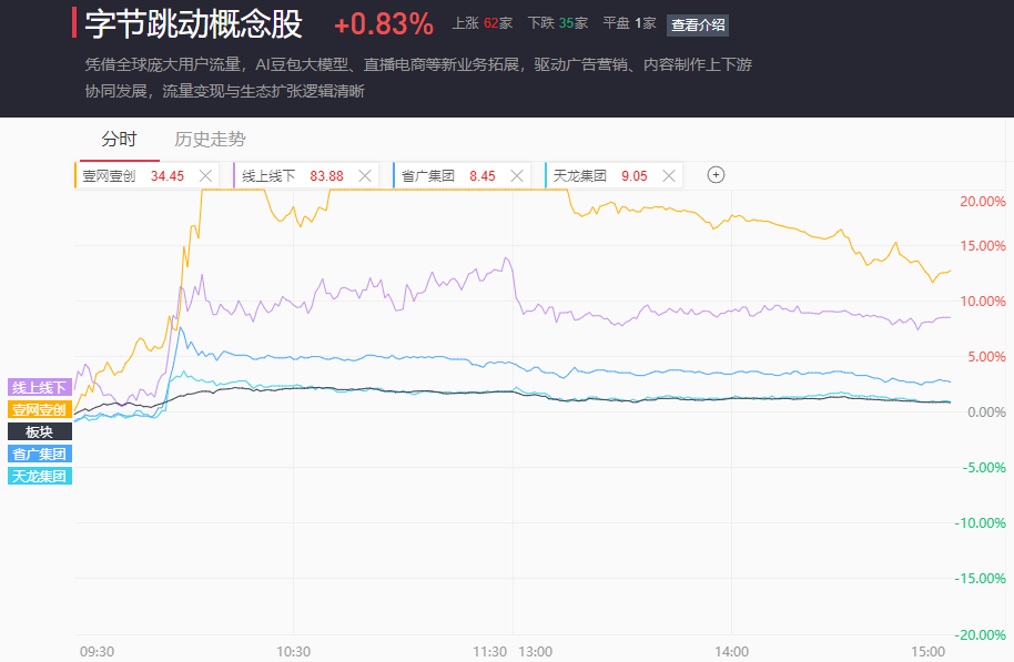 字节跳动概念股上午一度涨超2%,午后回落收涨0.83%。