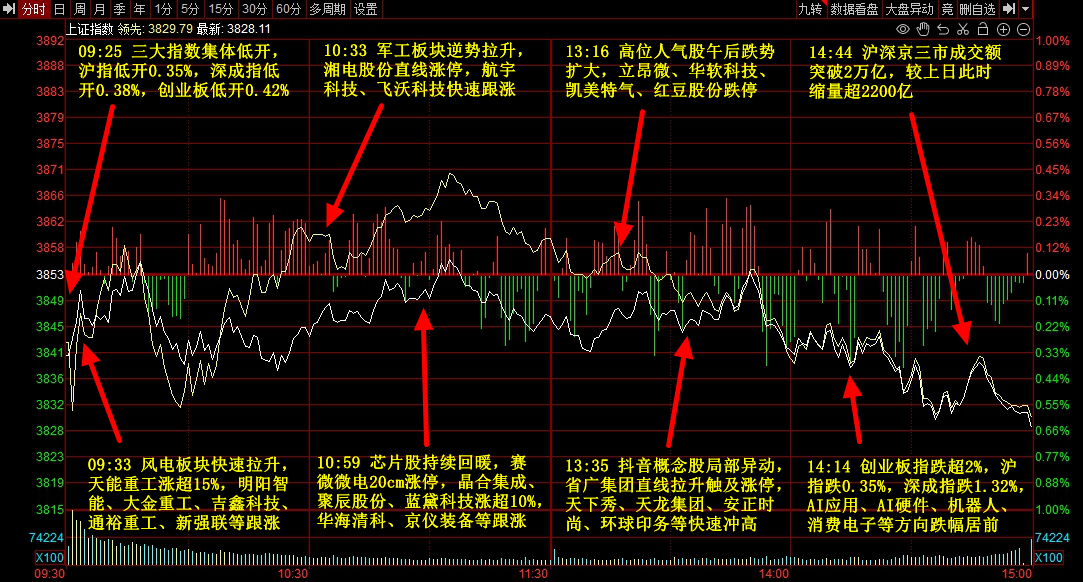截至收盘,沪指、深成指、创业板指分别收跌0.65%、1.76%、1.81%,市场超3400股下跌,1800余股上涨,两室成交量进一步萎缩至2.1万亿。