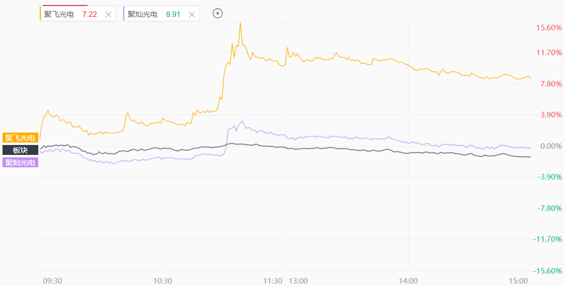 然后聚飞光电上午收盘前大幅拉升,股价一度张超15%,此后小幅回落最终收涨8.41%。