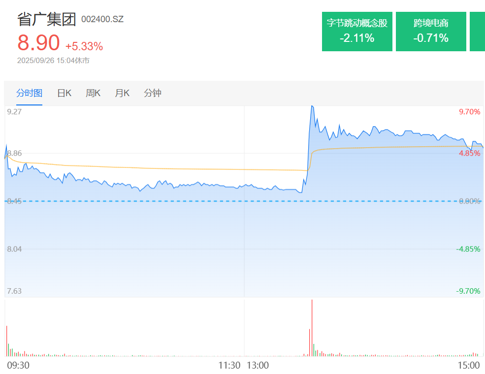 但瞬间摸板后又开始连续回落,最终省广集团收涨5.33%。