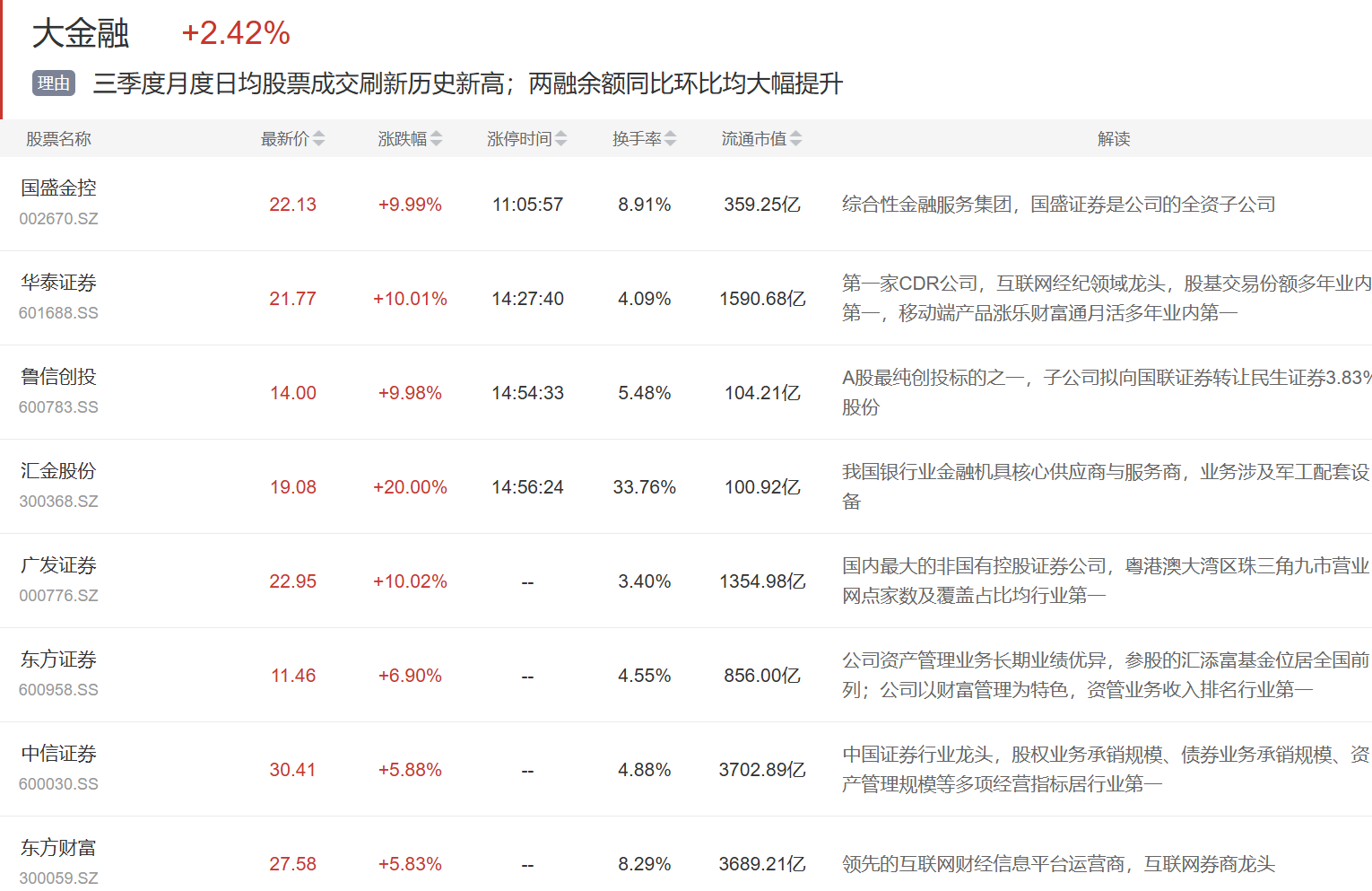 大金融板块今日走高,国盛金控、华泰证券,汇金股份等涨停,东方财富、中信证券大幅冲高。