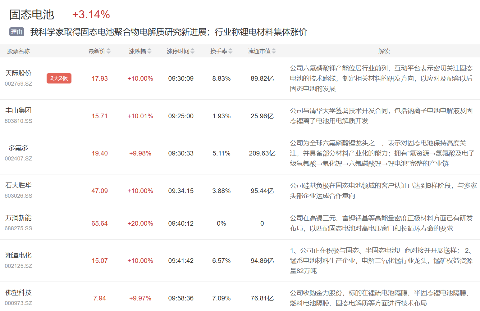 固态电池板块今日再度活跃,天际股份2连板,丰山集团、多氟多、石大胜华等多股涨停。