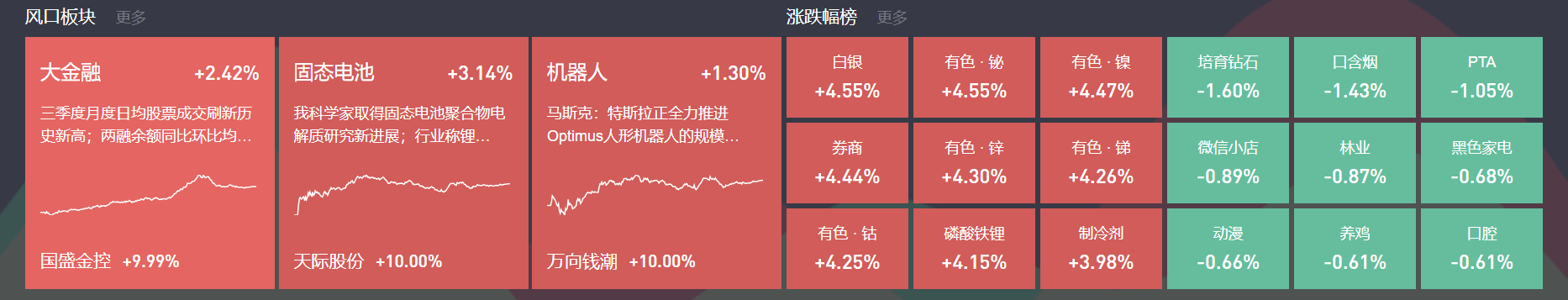 市场全天高开高走,沪指午后涨超1%,创业板指一度涨逾3%。券商等金融股集体爆发,广发证券、华泰证券、国盛金控涨停。固态电池概念股表现活跃,天赐材料、湘潭电化等封板。黄金股集体拉升,盛达资源等涨停。下跌方面,教育股逆势下挫,凯文教育、中国高科盘中跌停。个股涨多跌少,沪深京三市超3500股飘红,今日成交2.18万亿。