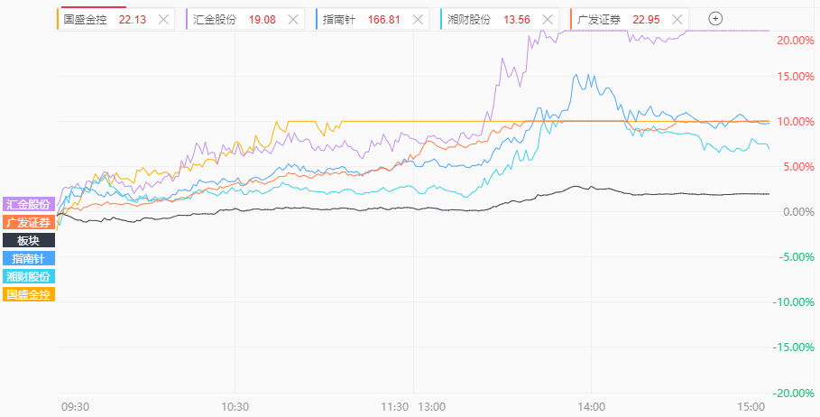 华泰证券、汇金股份(20CM)、新黄浦、广发证券(未封住)、湘财股份(炸)等纷纷涨停;