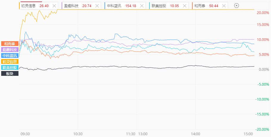 间接持股0.0229%的初灵信息,高开高走顺了拿下20CM涨停板;