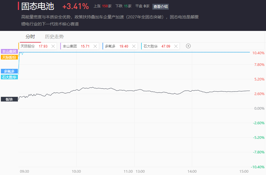 固态电池板块全天高开走强后震荡,最终收涨3.41%。