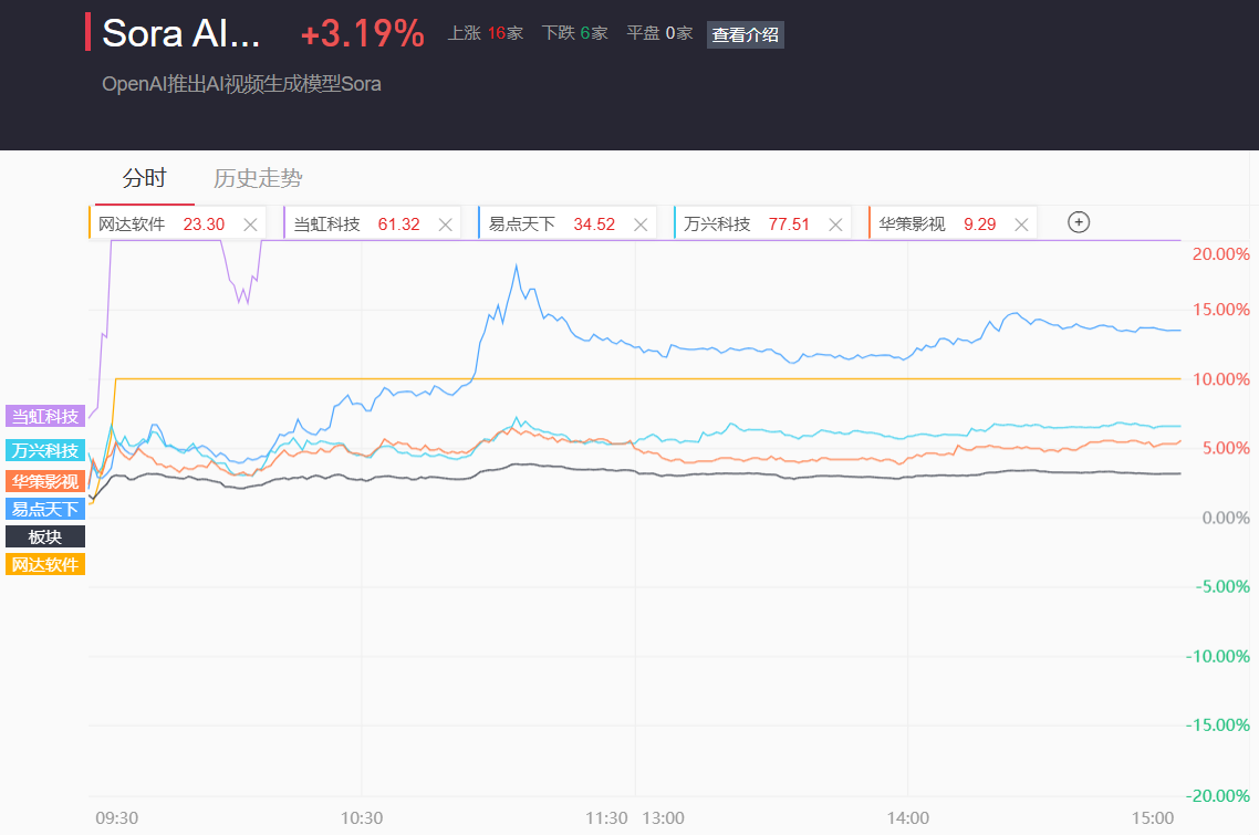 题材方面,sora AI视频开盘走强,网达软件、当虹科技(20CM)先后涨停,易点天下涨超13%,万兴科技、华策影视、虹软科技等跟涨;
