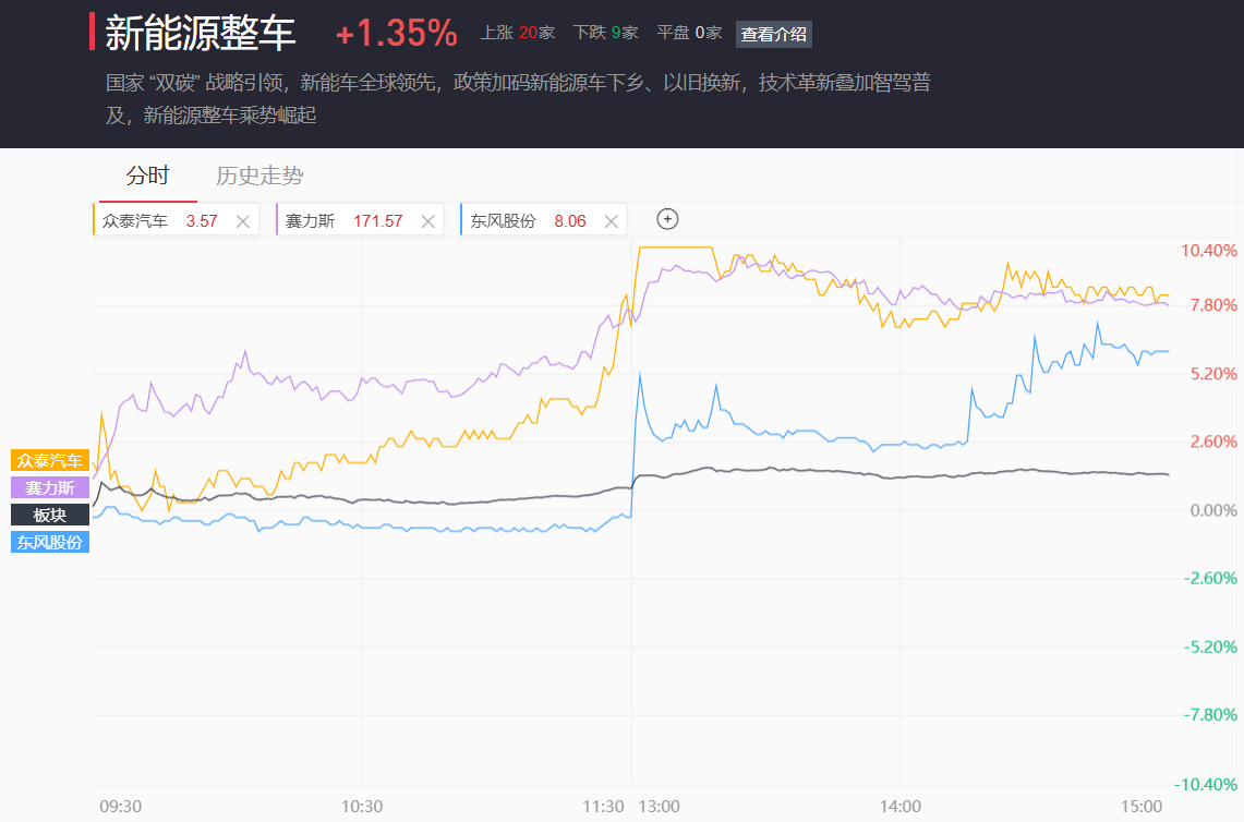 新能源汽车全天小幅红盘震荡,最终收涨0.65%;新能源整车午后明显上涨,收涨1.35%。