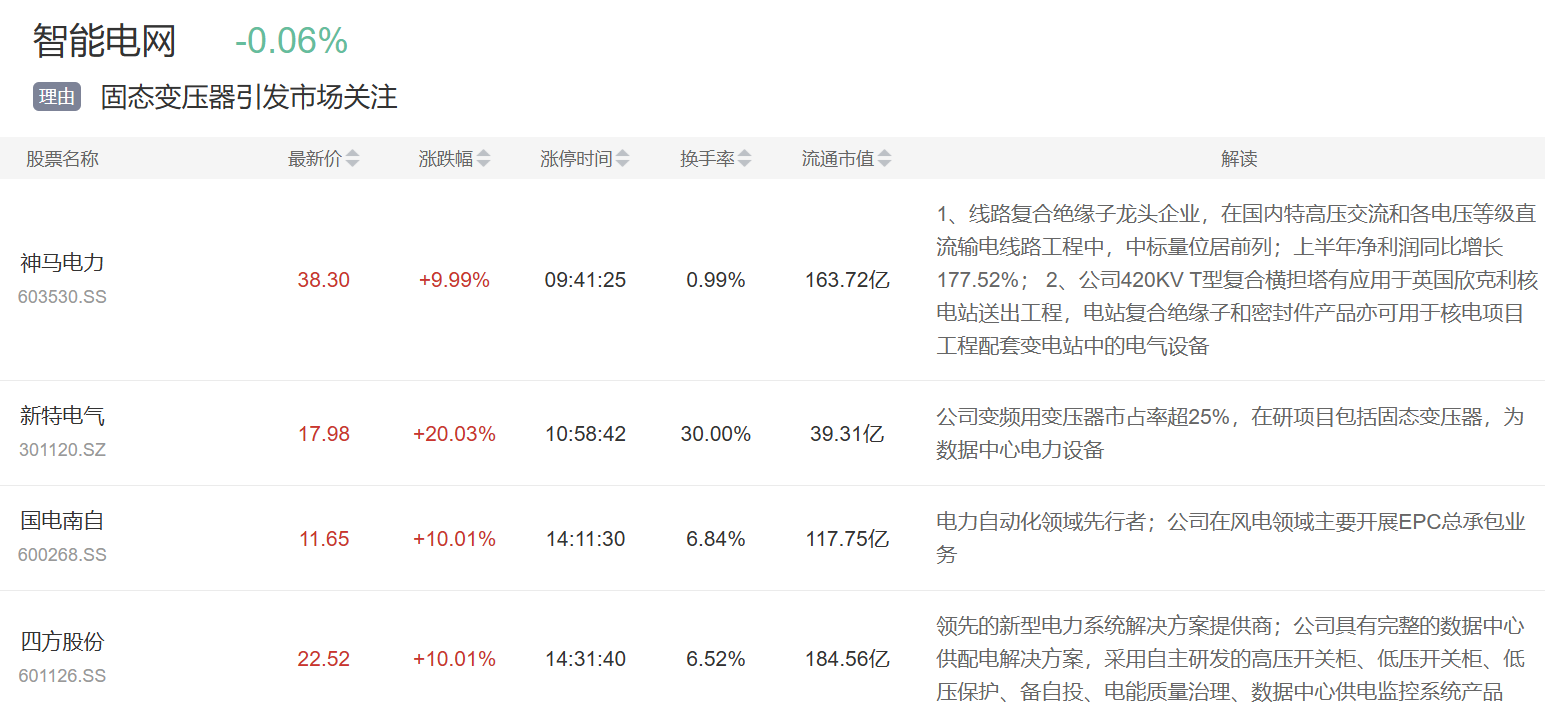 智能电网板块今日活跃,固态变压器印发市场关注,神马电力、新特电气、四方股份等多股涨停。