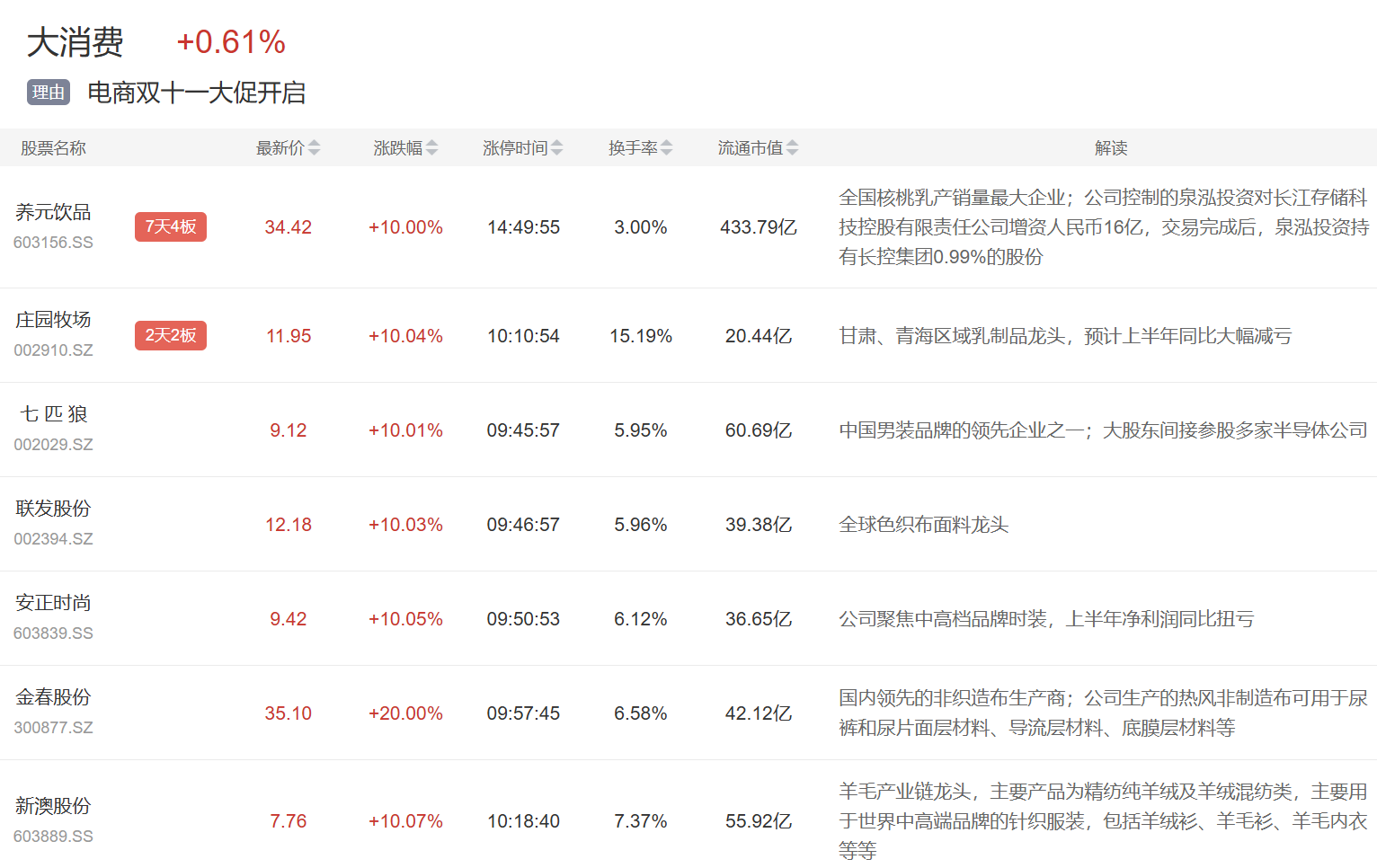 大消费板块今日大涨,养元饮品反包涨停、庄园牧场2连板,金春股份、新澳股份等涨停。
