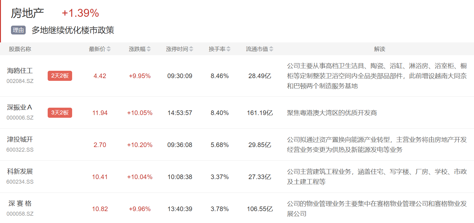 房地产板块今日表现,海鸥住工2连板、深振业A3天2板、津投城开、科新发展等涨停。