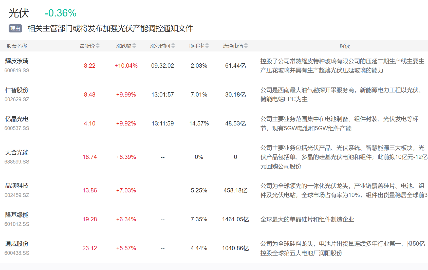 光伏板块今日活跃,耀皮玻璃、仁智股份、亿晶光电等涨停,隆基绿能、通威股份等涨幅均超5%。