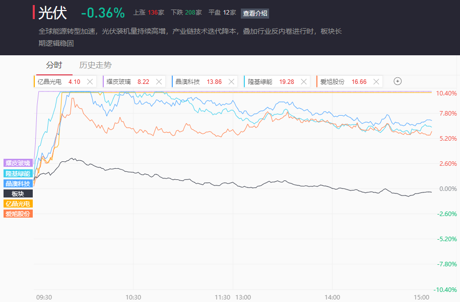 耀皮玻璃、亿晶光电、晶澳科技、隆基绿能、京运通、爱旭股份、华光环能、弘元绿能等集体涨停,除了耀皮玻璃、亿晶光电外其余均炸板;