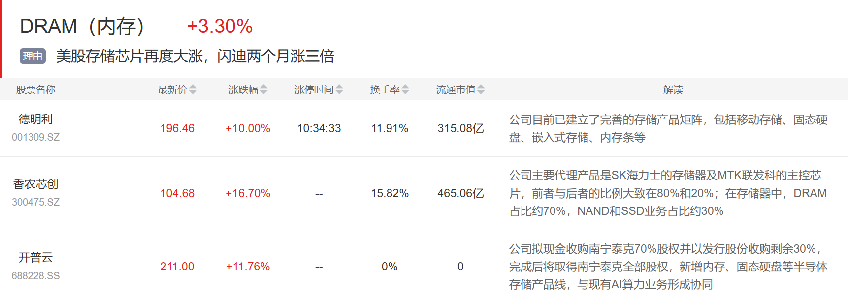 存储概念今日大涨,德明利涨停,香浓芯创大涨超15%创历史新高,开普云大涨超10%。