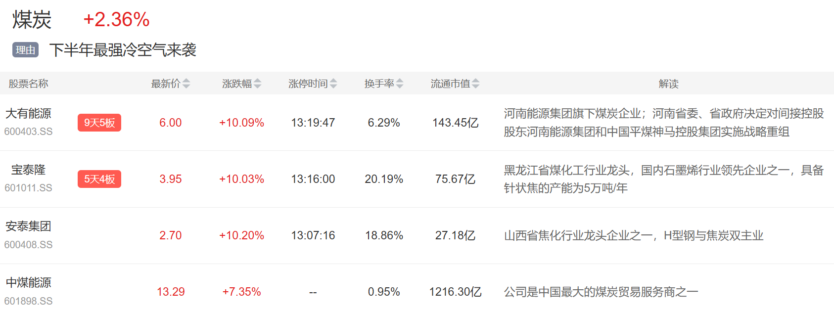 煤炭板块今日走高,大有能源3连板,宝泰隆、安泰集团等多股涨停。