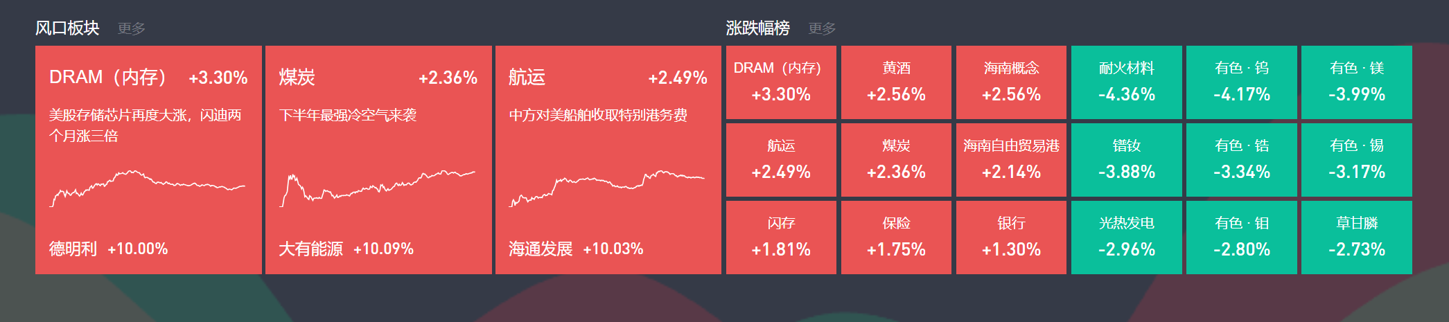除上述热点外,海南自贸区表现不俗,医药、国产芯片、固态电池局部活跃;跌幅方面,化工、核聚变等跌幅居前。