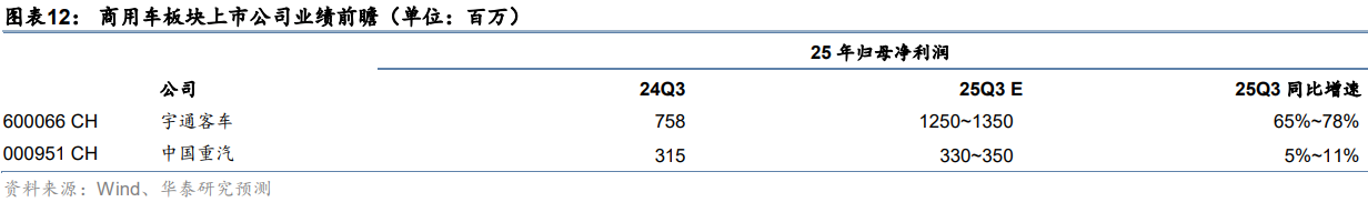 以旧换新补贴推动下,我国大中型客车25Q3销量同比+19%至3.1万辆,创近4年单季新高;其中新能源客车销量同比+22%。业绩方面预计龙头中国重汽-AQ3归母净利同比+5~11%;宇通客车Q3预计归母净利同比+65%~78%。