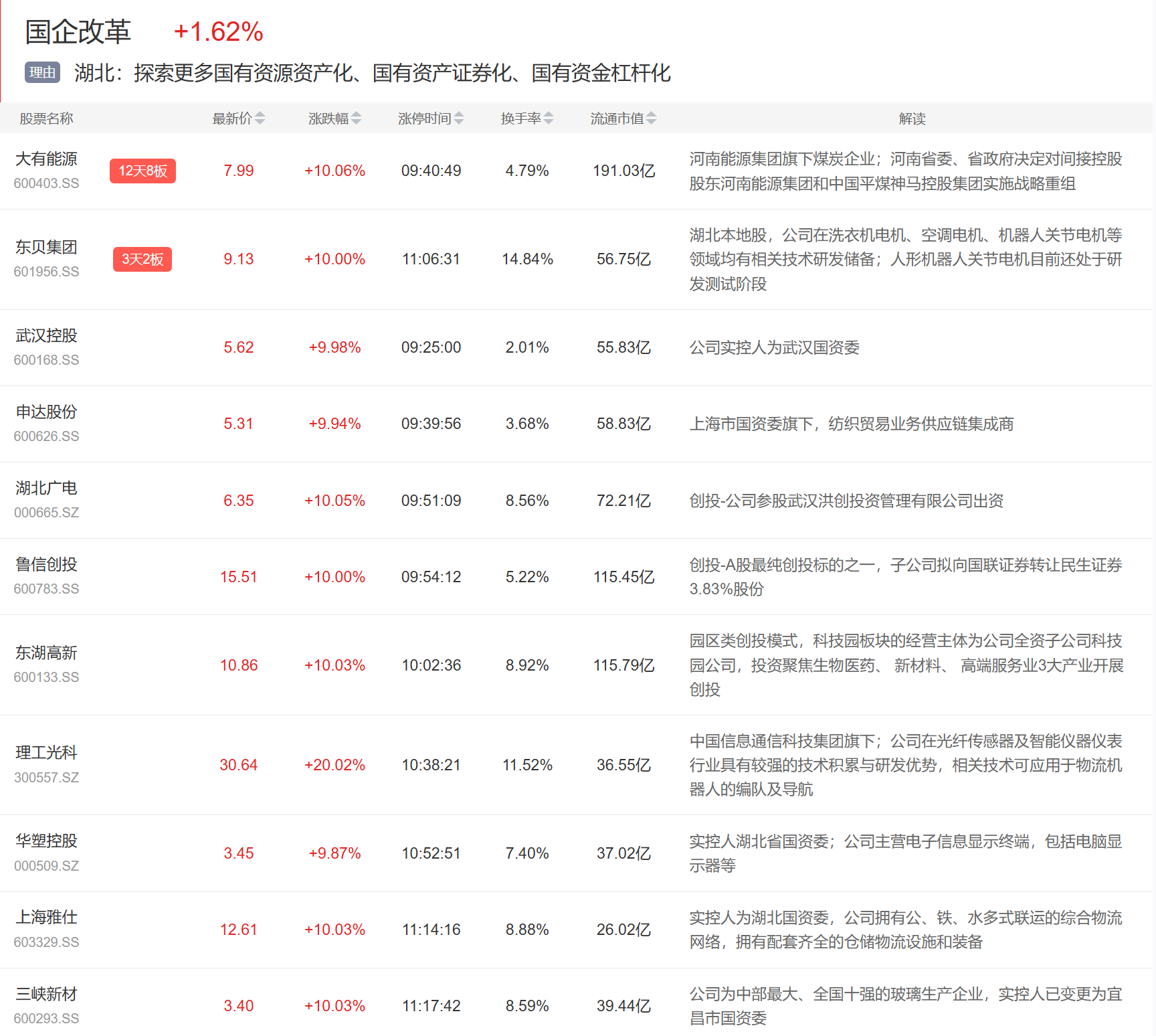 国企改革板块今日大涨,其中湖北国企改革表现突出,武汉控股一字板,湖北广电、东湖高新、理工光科等多股涨停。