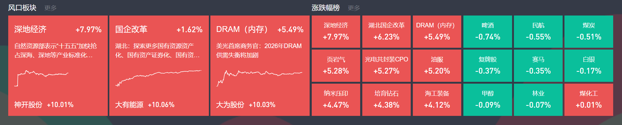 除上述热点外,内存、培育钻石、光通信等继续表现;跌幅方面,天然气、煤炭等跌幅居前。