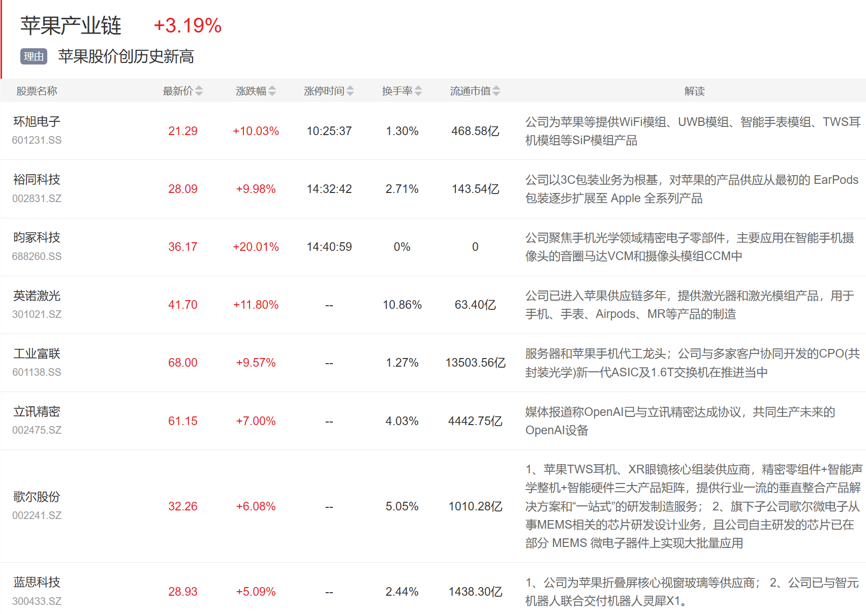 苹果产业链今日大涨,环旭电子、裕同科技、昀冢科技等涨停,大票立讯精密、歌尔股份等涨超5%。