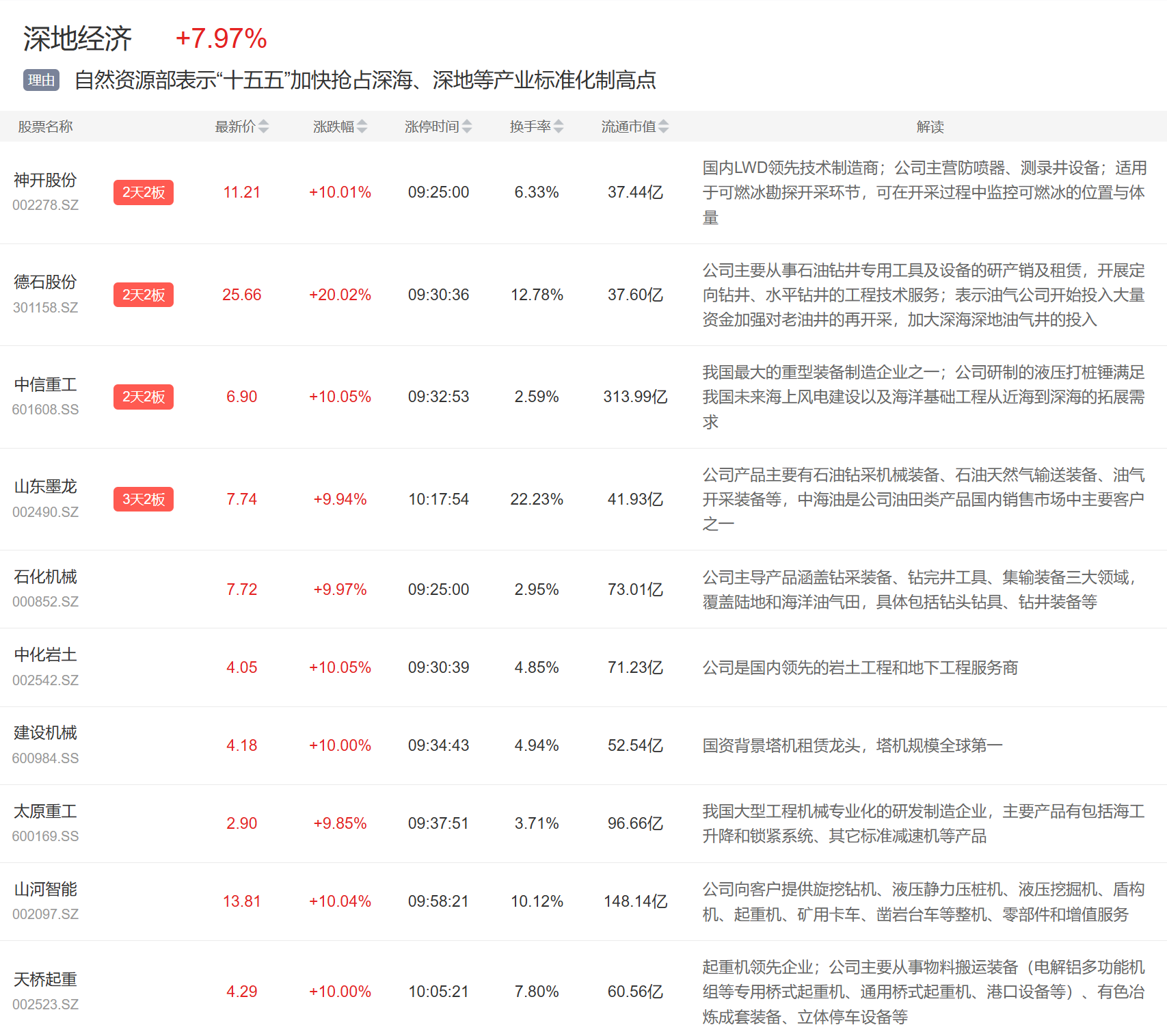 深地经济概念今日大涨,神开股份、石化机械一字涨停,德石股份、中信重工、山东墨龙等多股连板。