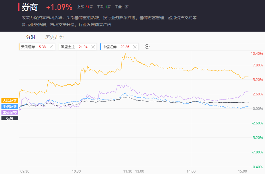 上午收盘前,天风证券一度触及涨停但未能一锤定音,此后便小幅回落收涨5.7%;